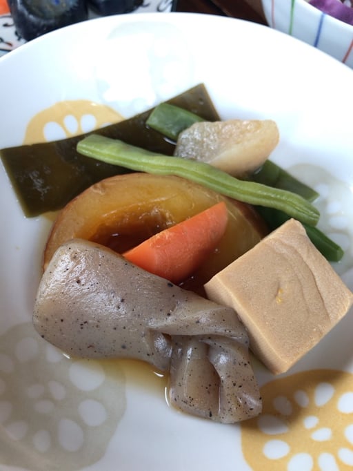 紫のじゃがいも、シャドクイーンは蒸しても美味しいとアドバイス頂きましたが、ジャガイモのガレットに!カボチャは煮物として頂きました!!そして、ツヤツヤしいピーマンは甘味と酸味のバランスが良く、玉ねぎを合わせて、ゴマ油と岩塩のみで頂きました。ピーマンはビタミンEが活性酸素を抑えて肌の老化をストップするとも言われておりますが、このツヤツヤ感そのままお肌に影響して欲しいと個人的には切に願いましよ!!煮物に入れた高野豆腐は、いつも頂いてる高野豆腐と違ってなめらかな高野豆腐です!こんにゃくも2種類と、昆布も!煮物ってなかなか食べないのでしょうか?!いつも人気の煮物はこれから美味しい季節になりますね。