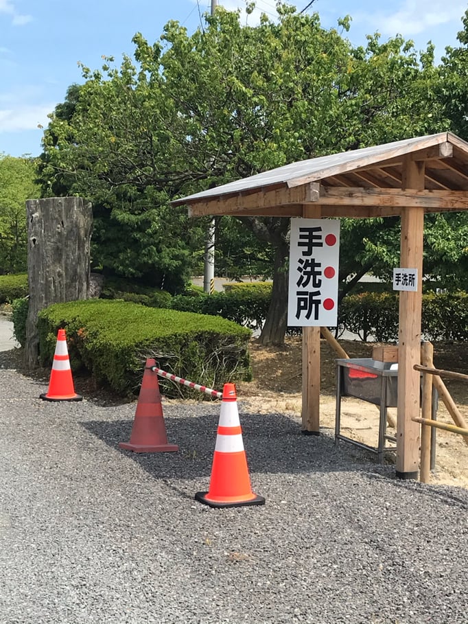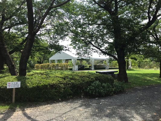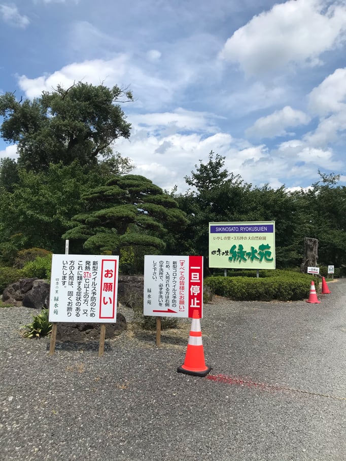ナビ設定としますと、緑水苑入り口に案内されると思います。ナビが無い方でも、近くに看板がありますので、看板通りにお進み下さい。一時停止の看板右手に手洗い所がございますので、一度車を降りて手を洗って下さい。その後、車にて奥の駐車場にお進み下さい。駐車場奥に案内所がございます。そちらで検温のご協力をお願い致します。テントは公園内、休憩所奥ににございますので、お進み下さい。