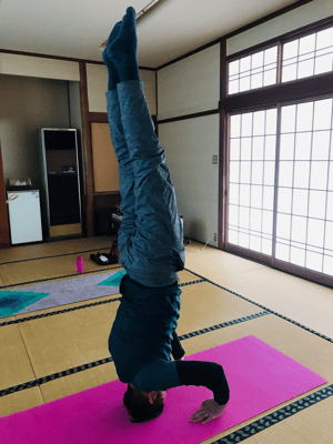 細々と続ける事数年…コロナの渦で時間が取れた事もあり、月に1回90分を真面目に1年間続けたところ、なんと逆立ちまでできるようになりました!!Yさんは猫背を直したいと始めたのですが、最初は割座もままならず、足首も返らない中、割座が可能になり、股関節が緩んだ事で、カメのポーズで肘がつくまでになりました!(写真3)継続は力なり!そして、何より若返っていらっしゃいますね!姿勢が良くなるってやはり若く見えるポイントとしてはとても大事な事ですよ!と、いつも皆さんに言っておりましたが、Yさんの変化から、他のメンバーさんも刺激を受けたようです。